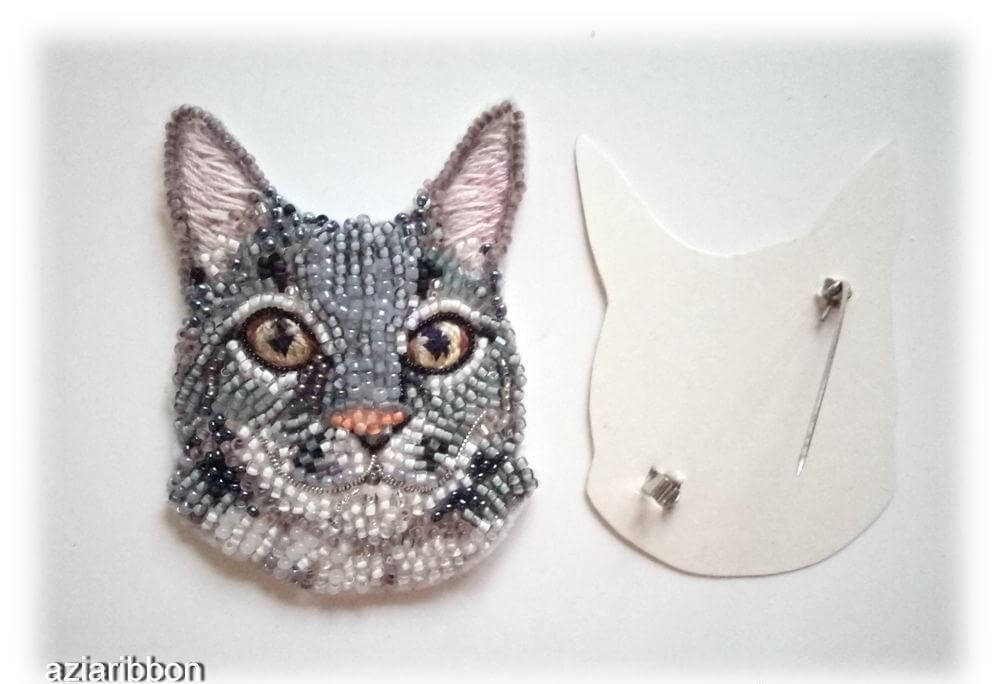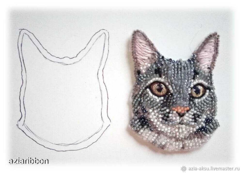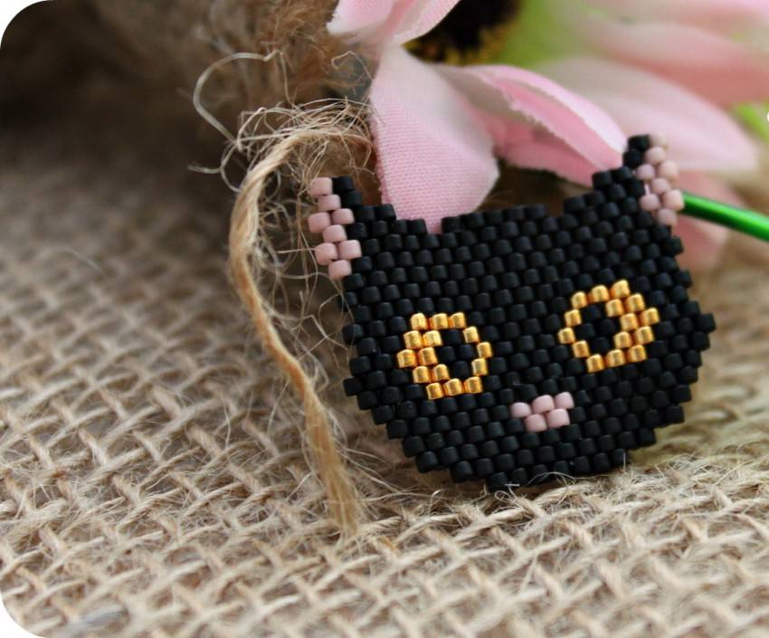 Расшитая бисером брошь может иметь самые разнообразные формы: цветы, насекомые, животные, сладости, эмблемы и многое другое. Шаблонов в сети много, выберите понравившийся или нарисуйте свой. Посмотрите, насколько мило выглядит этот котенок по имени Гав в бисере.
