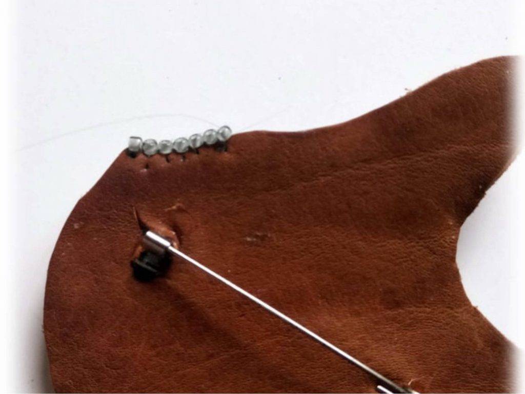- К поверхности кожаной детали приклеиваем металлическую булавку, позволяющую зафиксировать брошь в вертикальном положении;