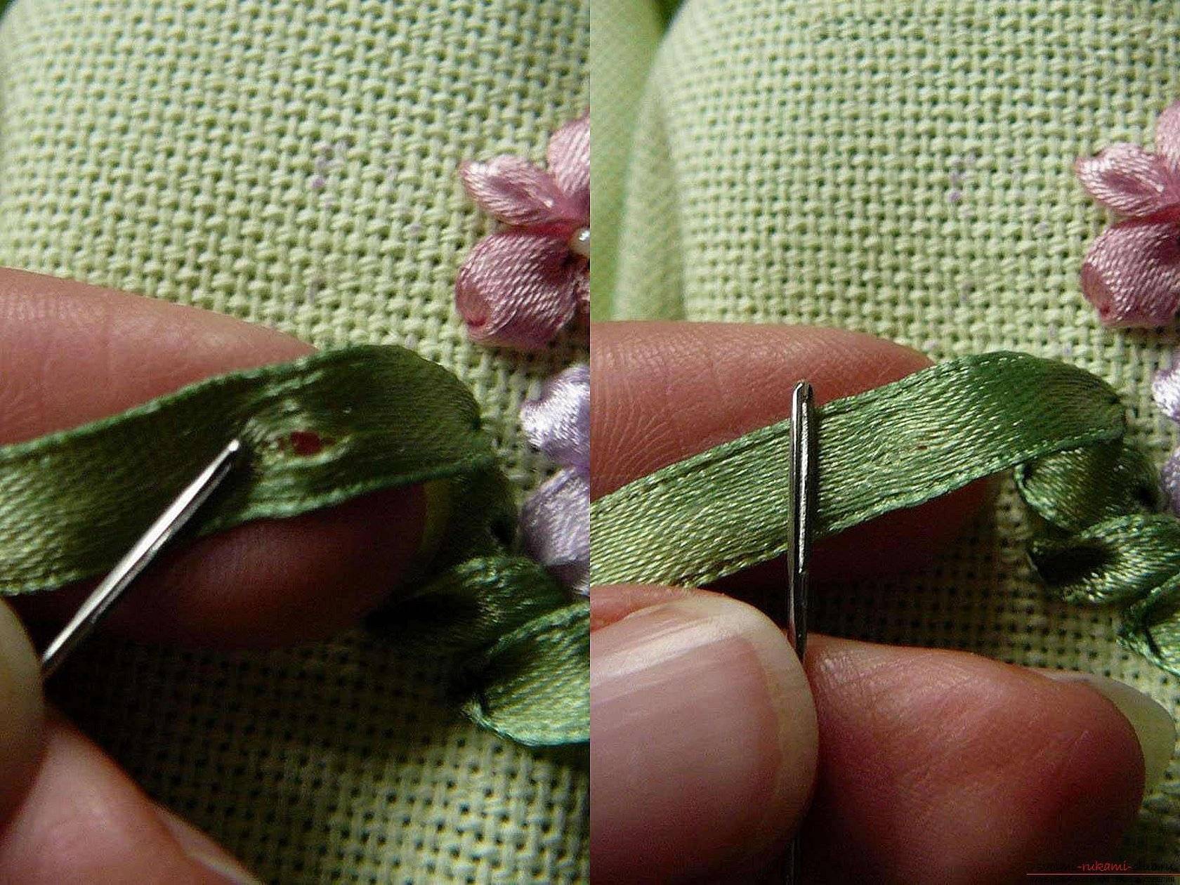 - Чтобы вышивка была аккуратной с двух сторон, нельзя делать переход лентами. Если был вышит один цветок, лента закрепляется, только потом фиксируется новая лента.