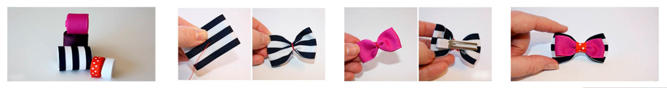 Очень красивый бант, который хорошо подойдет для украшения на голову. Для этого три или четыре (или даже больше) кусочка ленты одной ширины, но разной длины нужно сшить знаком бесконечности и вложить один в другой. Серединку оформите как в нескольких мк ранее.