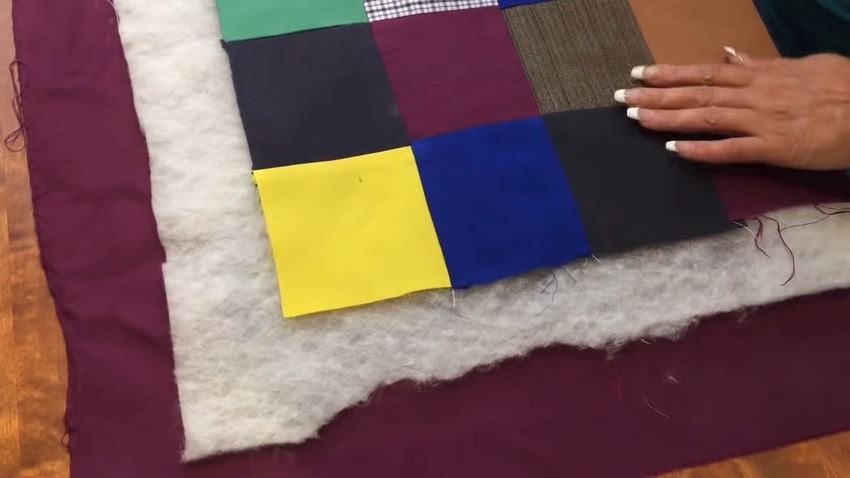 | 5 | ![]() | Затем разложите на чистом полу или обширной рабочей поверхности ткань для подклада. Сверху расположите утеплитель и изделие, сшитое из квадратных лоскутов. Каждый последующий слой должен быть на 7 см меньше с каждой из сторон. Нижнюю ткань нужно зафиксировать изнаночной стороной вверх, чтобы блок не съезжал. Для этого можете использовать скотч. |