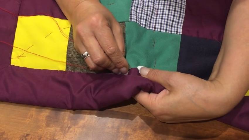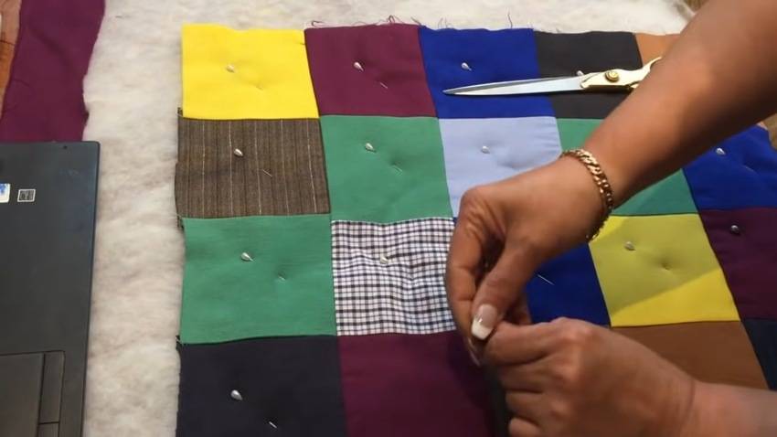 | 6 | ![]() | Далее закрепите каждый квадрат булавкой, начиная от центра, хорошо натягивая ткань. После этого приступайте к сметыванию одеяла вручную (так же от центральной части), делая строчки в разные стороны по всему периметру. |