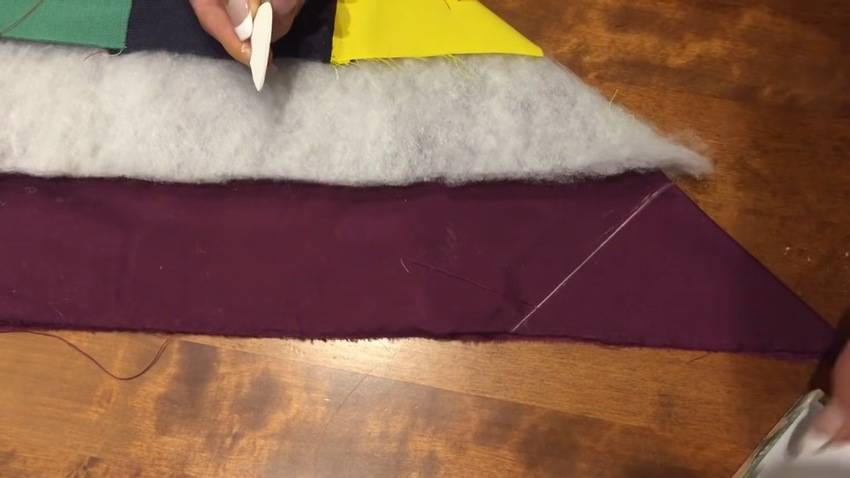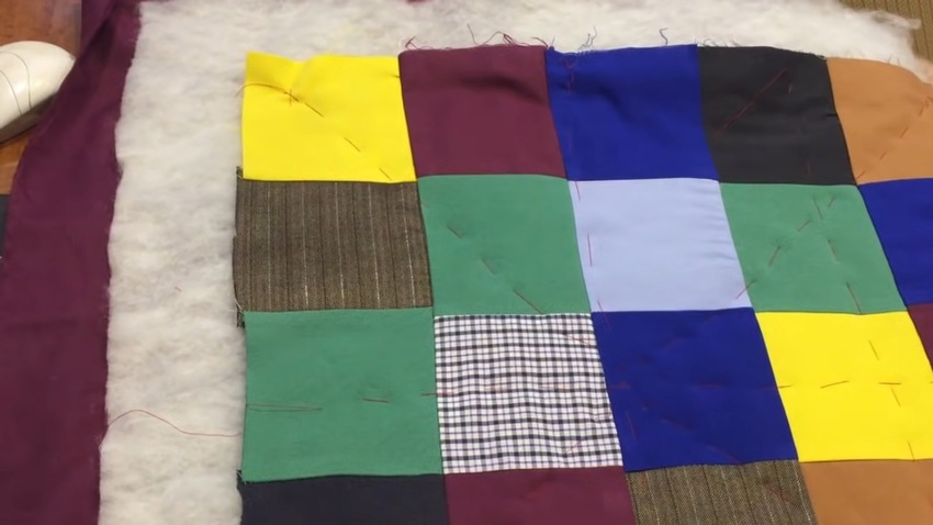 | 7 | ![]() | Затем уберите все булавки, отклейте скотч и приступайте к стежке полотна, делая мелкие швы в местах соединения квадратов, захватывая все 3 слоя. |