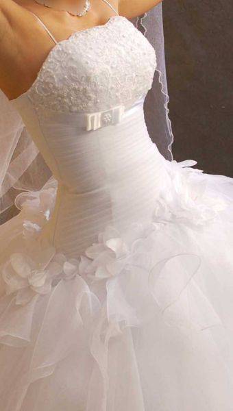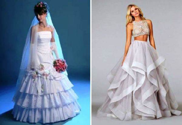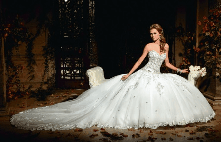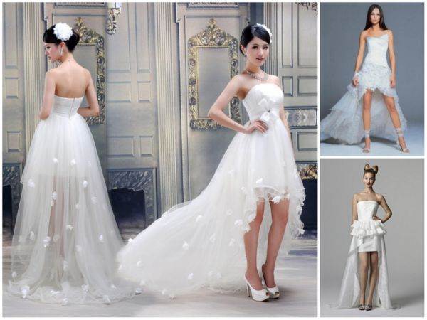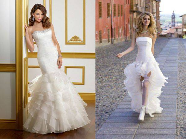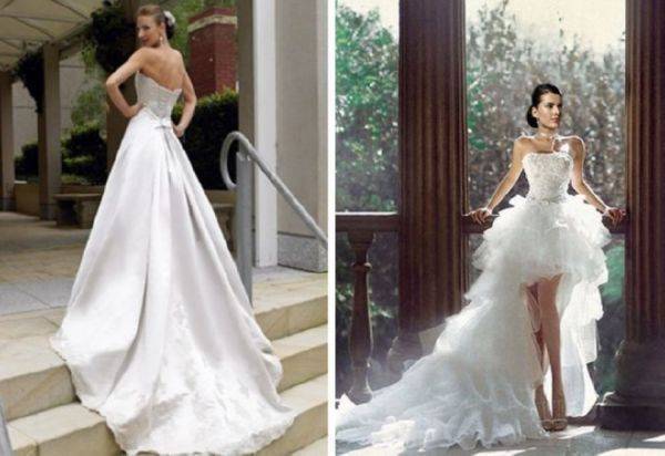 Особенной любовью у невест в последнее время пользуются корсетные платья, имеющие которую переднюю часть и шлейф. В некоторых моделях шлейф отстегивается, позволяя изменить наряд до неузнаваемости.