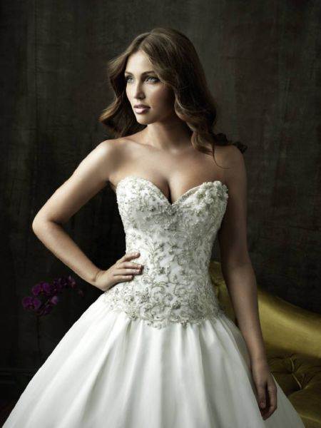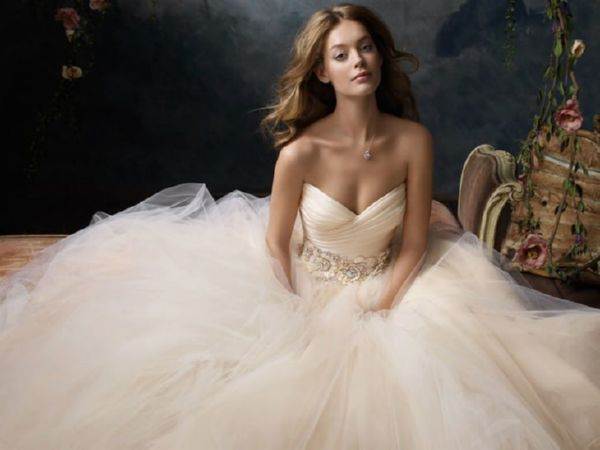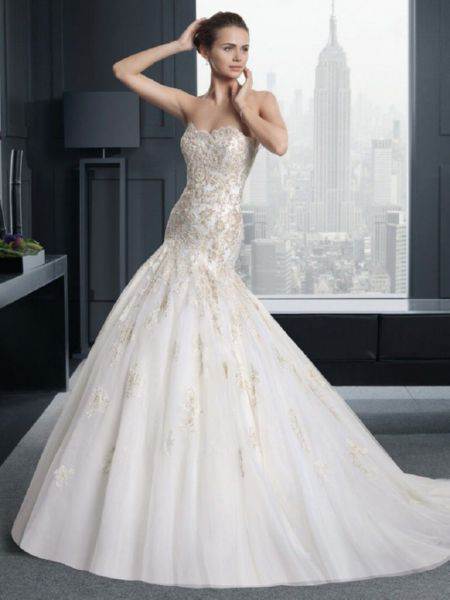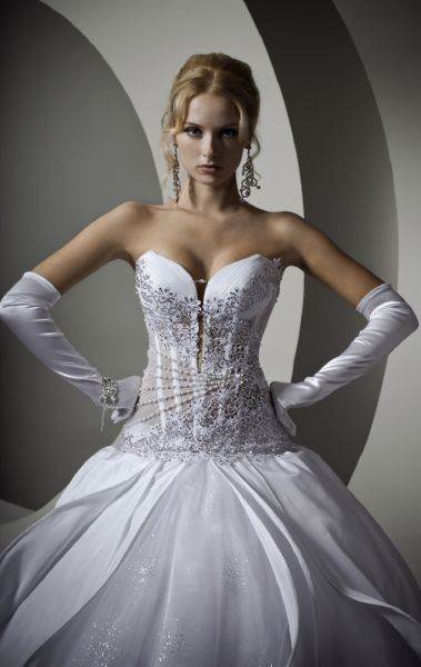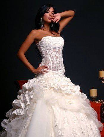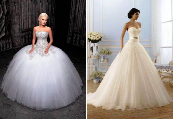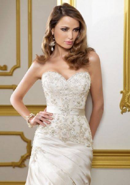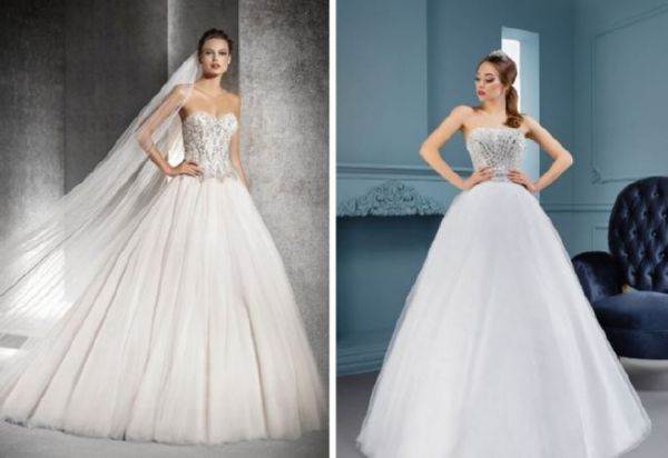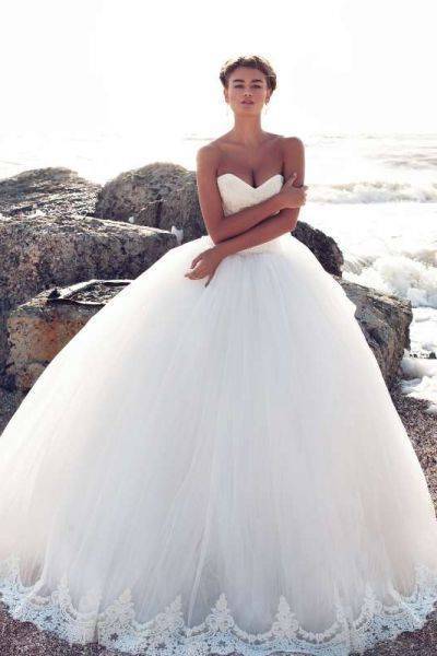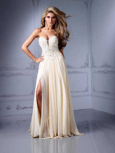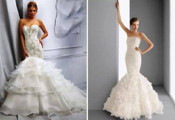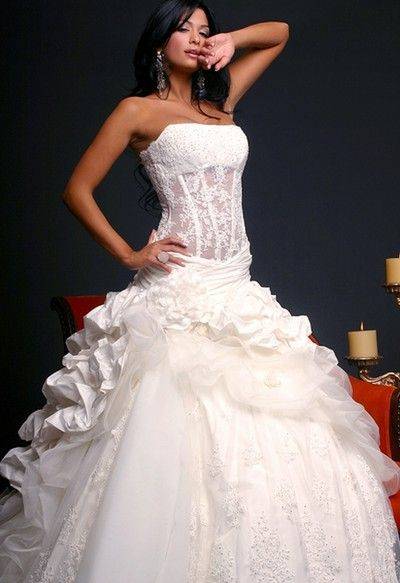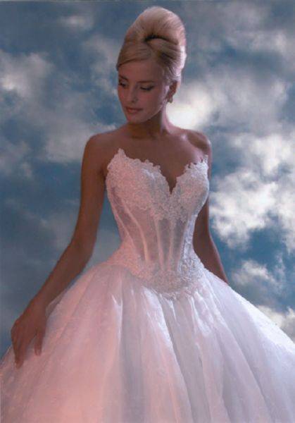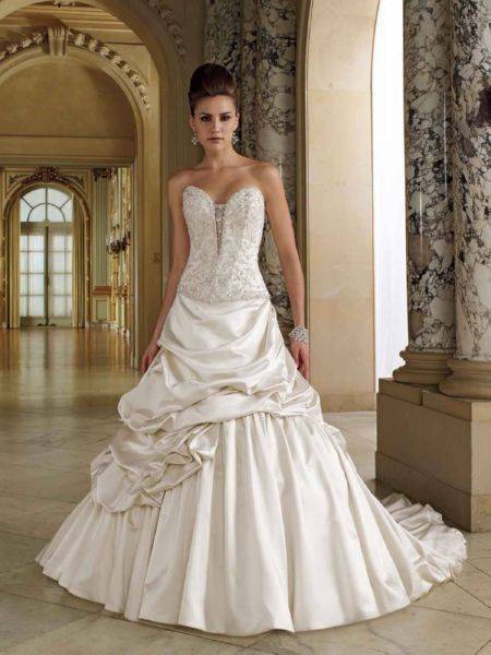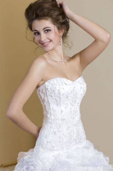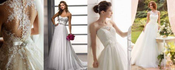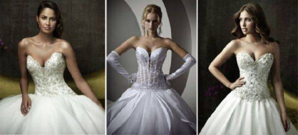 Это модели торжественных платьев, например свадебных, сочетаются с пышным низом. Для невест с небольшой грудью такой фасон подчеркнет зону декольте.