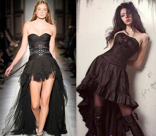 В подобных моделях нередко используют яркие цвета и легкость образа создаётся за счёт шлейфа из фатиновых и шифоновых тканей. Данный фасон распространен среди любителей готического стиля в одежде и к тому же сочетается с любыми аксессуарами.