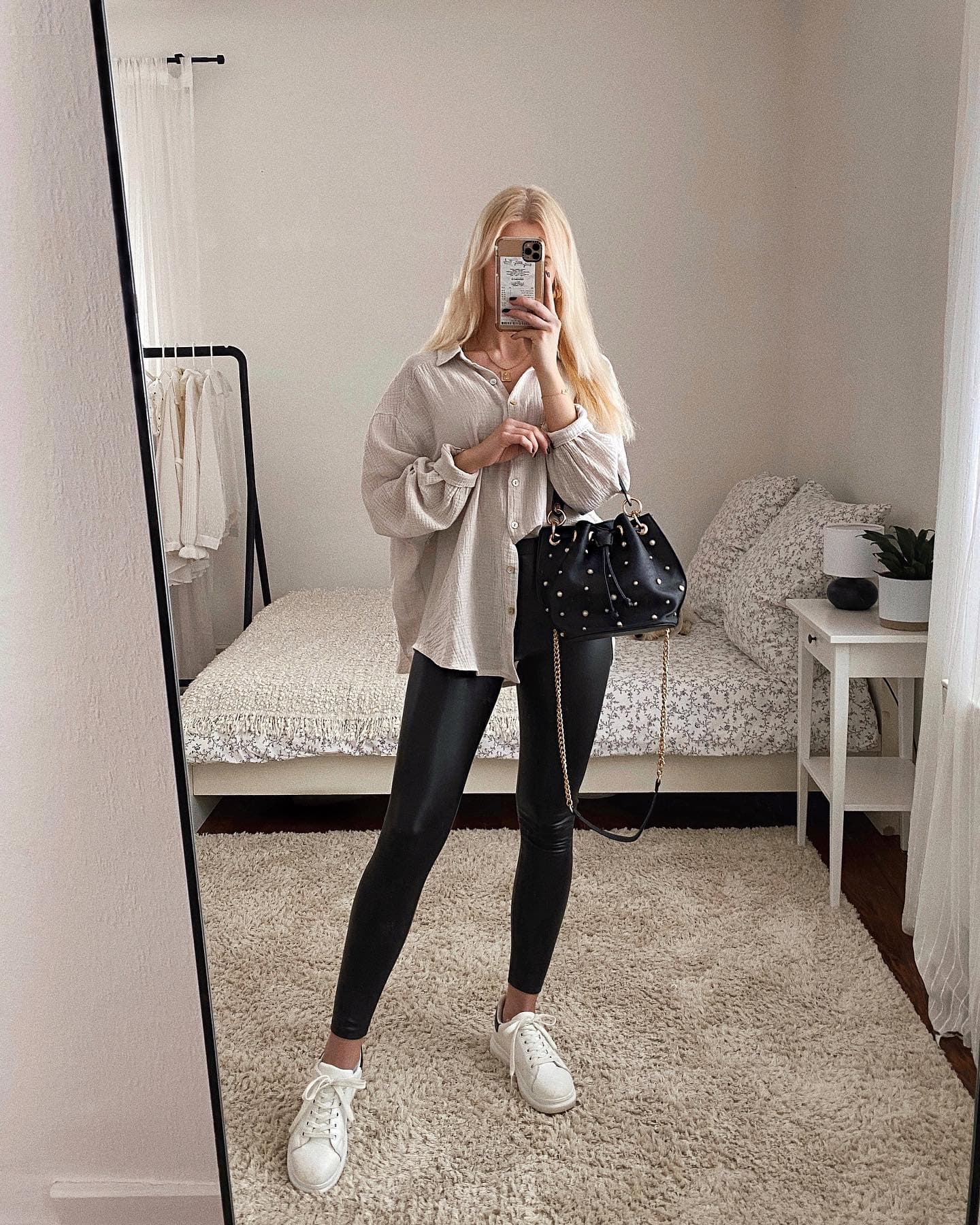 В рейтинге модной одежды для девушек-подростков до 16 лет и старше всегда фигурируют спортивные штаны: они должны быть просторные и объемные с резинкой на щиколотках. Чаще всего в стильных образах можно увидеть серые “бананки”. Такие штаны лучше всего смотрятся с толстовкой oversize, просторной футболкой или гольфом.