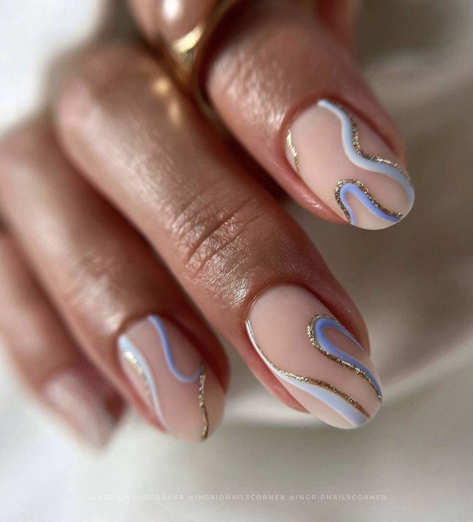 Не забыли еще, что тренд зимнего маникюра 2023 — это естественность? Именно поэтому нюдовый дизайн с блестящим декором — очень модный вариант. На нюдовой базе хорошо смотрятся золотистые рисунки, наклейки, жидкий металл, фольга и стразы. Такой фон словно уравновешивает чересчур интенсивный блеск декора и позволяет избежать пошлости и чрезмерности.