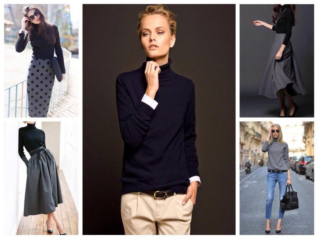 Водолазка. Более теплый вариант из базы. Здесь в ход могут пойти уже более насыщенные, глубокие оттенки, но в то же время такие, которые без труда можно включить в общую гамму гардероба. Это белый, черный, коричневый, серый, синий, бежевый тона. Приглушённые оттенки вышеперечисленных тонов — идеальный гармоничный вариант.