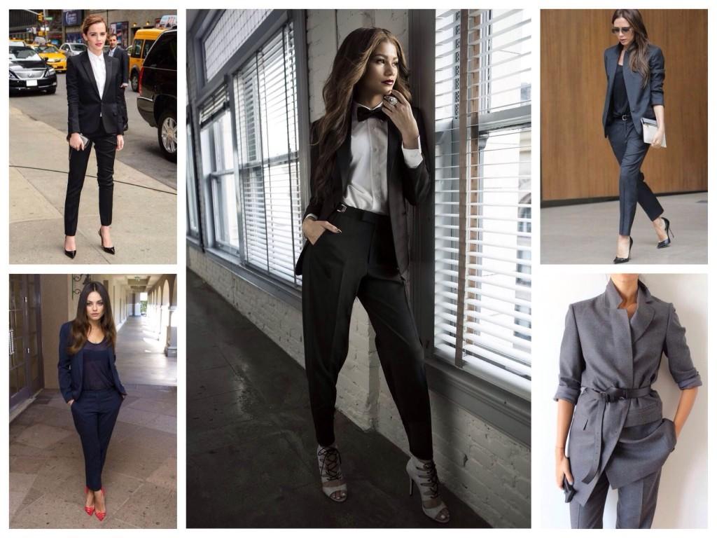 Брючный костюм или костюм с юбкой. Стандарт для деловой леди и очень удобный повседневный вариант для работы.