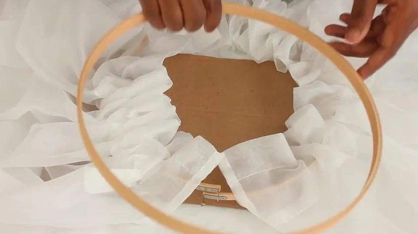 - Ткань расположить равномерно, чтобы боковые стороны свисали. Посередине полотно будет натянутым.