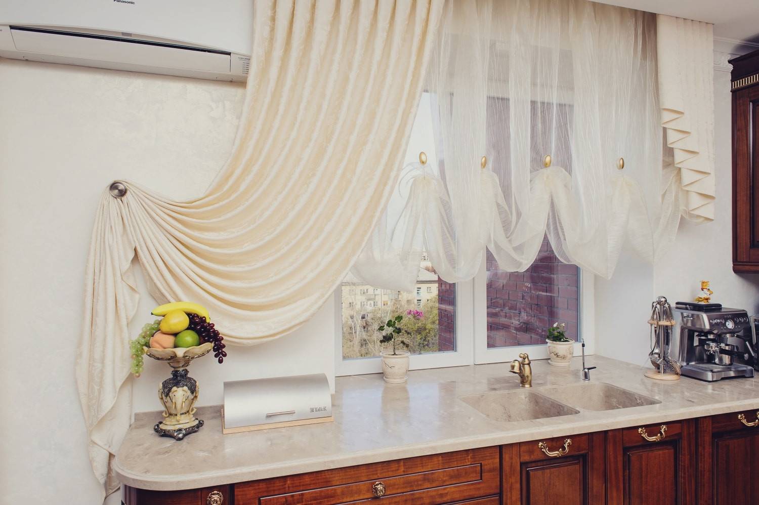 Тюль на кухонных окнах был во все времена. Больше изделие играет роль декора и гармоничного дополнения к интерьеру. Но стоит понимать, что с учетом особенностей помещения, испарений от приготовления еды, пары будут оседать часто. Это можно заметить в небольших каплях на материале. Поэтому главным критерием такого кухонного текстиля является его устойчивость к загрязнению и простота в стирке. Отличным решением станет материал с составом полиэстера. По выбору цвета лучше остановиться на однотонных, не перегружая декор.