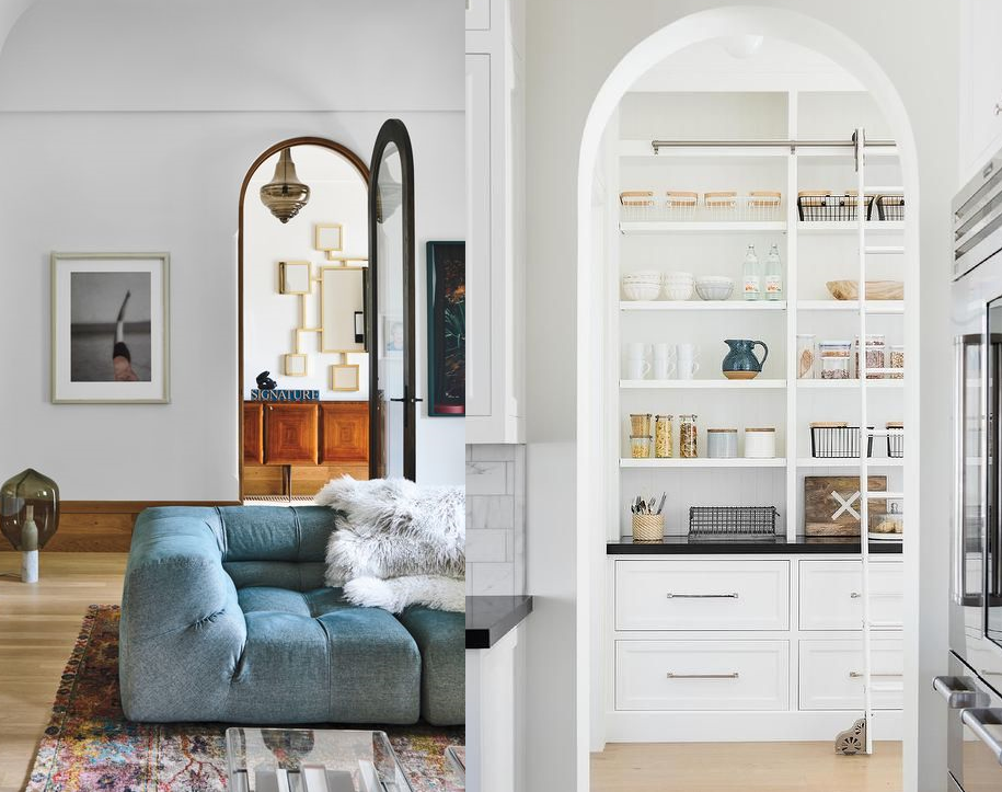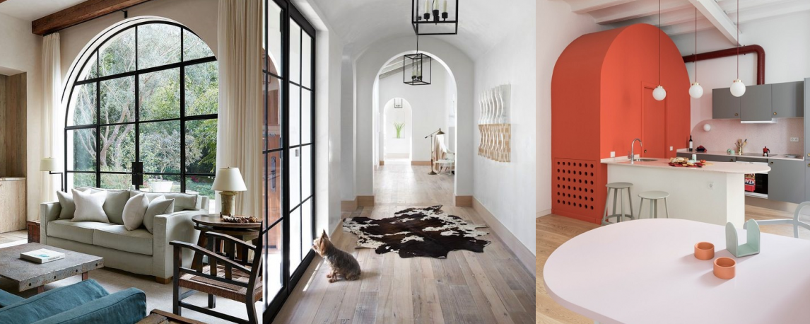 Арочную форму в современных интерьерах принимают не только дверные проёмы, но также мебельные фасады, зеркала, декоративные перегородки и ширмы.