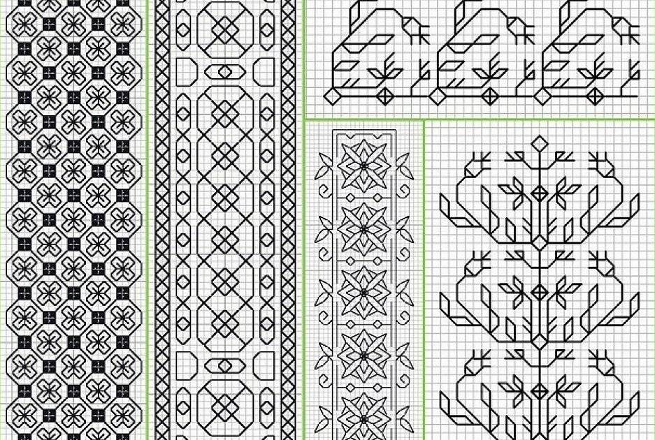 Что еще нужно знать о блэкворк. Существуют особые схемы вышивания в технике блэкворк. Эти схемы возможно разделить на две основные группы: оттеночные и контурные. Вышивая по контурной схеме, вы обозначаете швом только очертания объектов. Подобные работы выглядят просто, если не подобран необыкновенный сюжет или же вышивка не кружевная. Схемы, по которым возможно вышить целые картины, где плотность вышивки определяет насыщенность цвета (от черного к светло-серому), более трудоёмки. Хотя и результат выглядит очень впечатляюще. Живописные тени, блики, иллюзия объёма — всё это возможно передать на вышивках, выполненных незамысловатой с первого взгляда техникой блэкворк. Комбинируя различные узоры в стиле блэкворк между собой, можно созадть свои собственные шедевры. Примеры узоров: