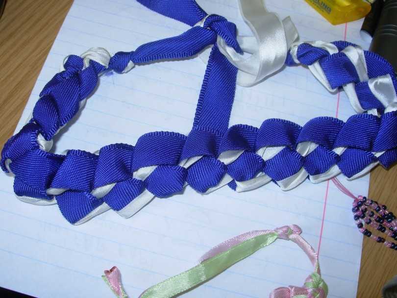 В самом начале необходимо подготовить материалы, которые понадобятся при изготовлении украшения. К ним относятся две метровые ленточки, ширина которых должна составлять примерно 1 сантиметр. Хотя опытные рукодельницы могут работать и с более широким материалом. Сама техника выполнения выглядит следующим образом: