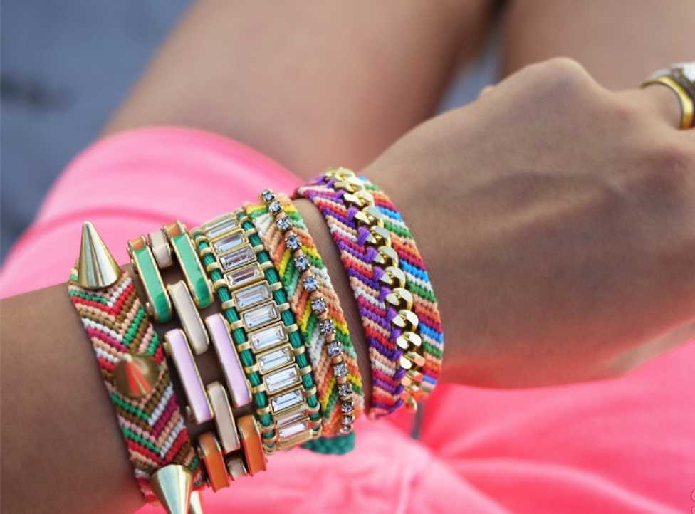 Этим летом также популярно комбинировать несколько украшений на одной руке, причем смешиваются не только цвета, но и различные модели, фасоны браслетов. Так, вполне допустимо соединять в один образ красивый черно — белый ободок, широкий атласный напульсник, тонкую змейку, где ведущую роль играет маленькая бусинка . Допускается такое количество браслетов, которое закрывает руку от запястья до локтя.