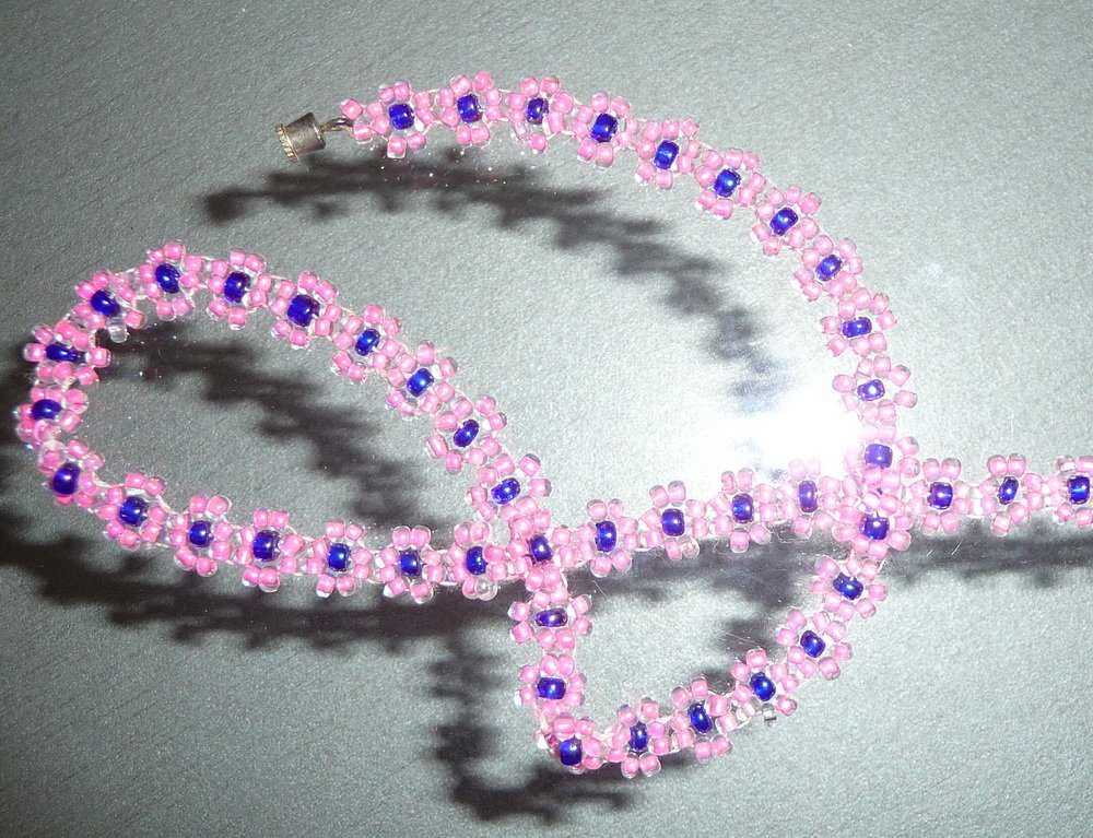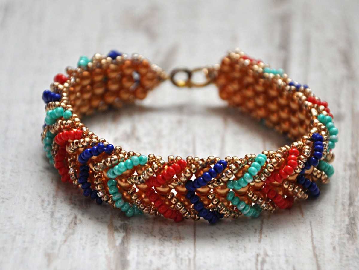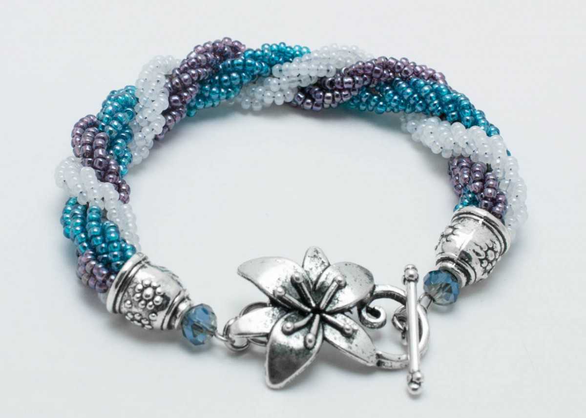 Смотрится шикарно благодаря своим хитросплетениям. Смысл плетения браслета заключается в следующем: возьмите декоративную леску или проволоку, нанизайте на нее бусинки и с помощью крючка для вязания сделайте воздушную петлю, в основе которой будет пара бусинок. Таким образом, должна быть оформлена вся длина браслета. В некоторых воздушных петлях рекомендовано нанизывание натуральных камней или других декоративных изделий большего размера. Браслеты из бусин мастер-класс можно сделать благодаря данным интернет-источников, в которых лучшие мастерицы страны показывают свое умение в плетении уникальных ювелирных изделий.