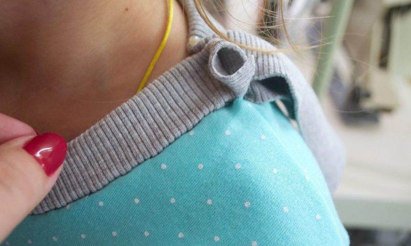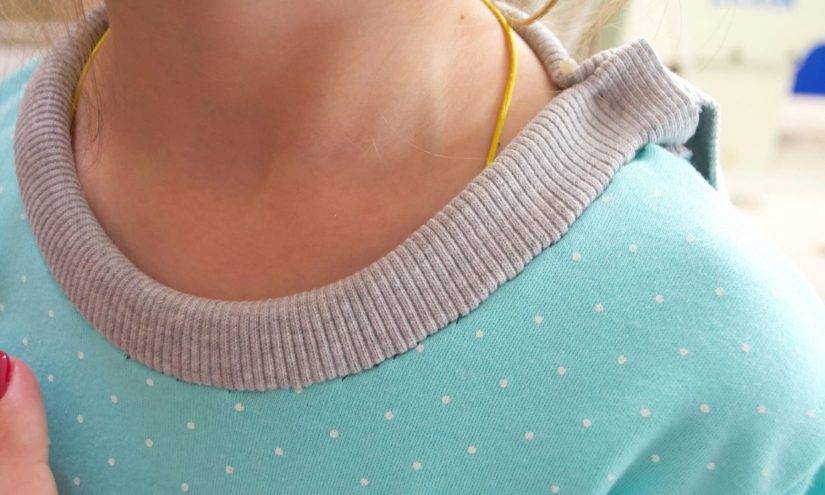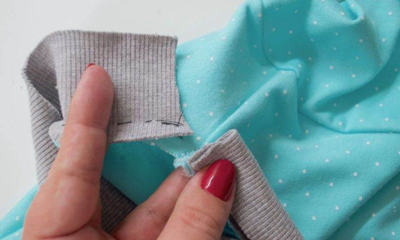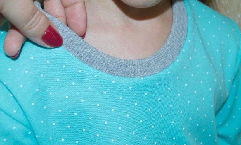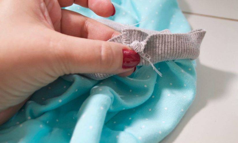 - В местах соединения бейки с горловиной образуются складки — так не должно быть. Это может значить только одно: сильно растянули срезы бейки. И чтобы исправить этот дефект, необходимо отпороть бейку и ослабить её натяжение, удлинить её, поэтому и не стоит торопиться и сразу обрезать излишки бейки.