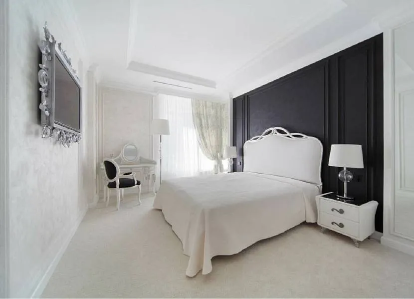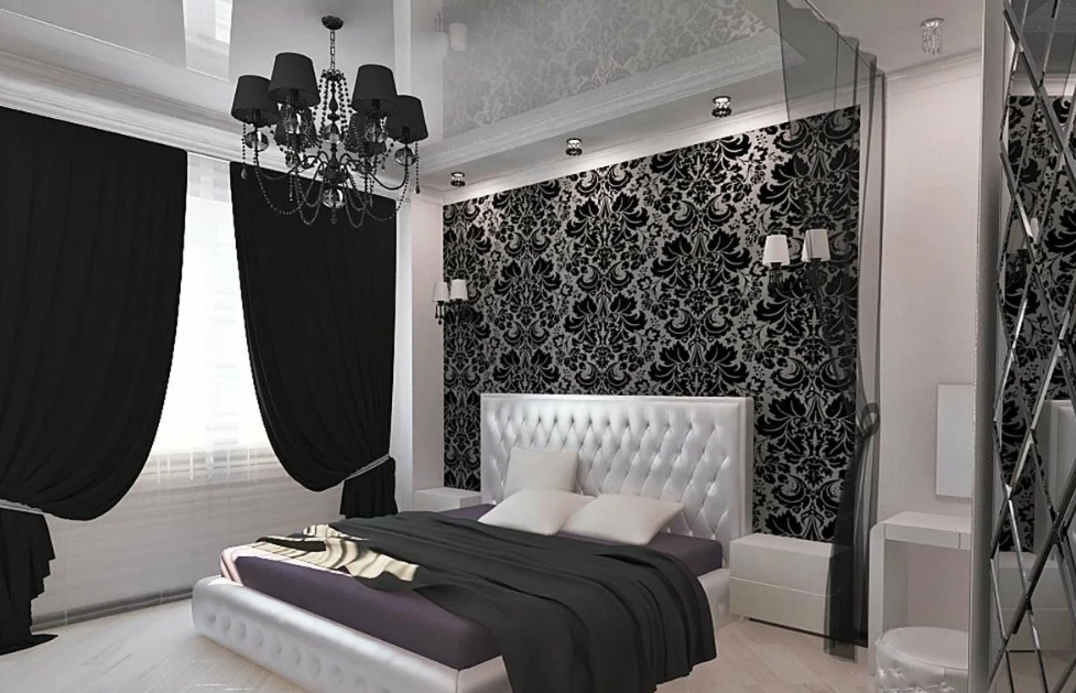 Обои для спальни черно белые будут очень органично смотреться в сочетании с правильно выбранным потолком.