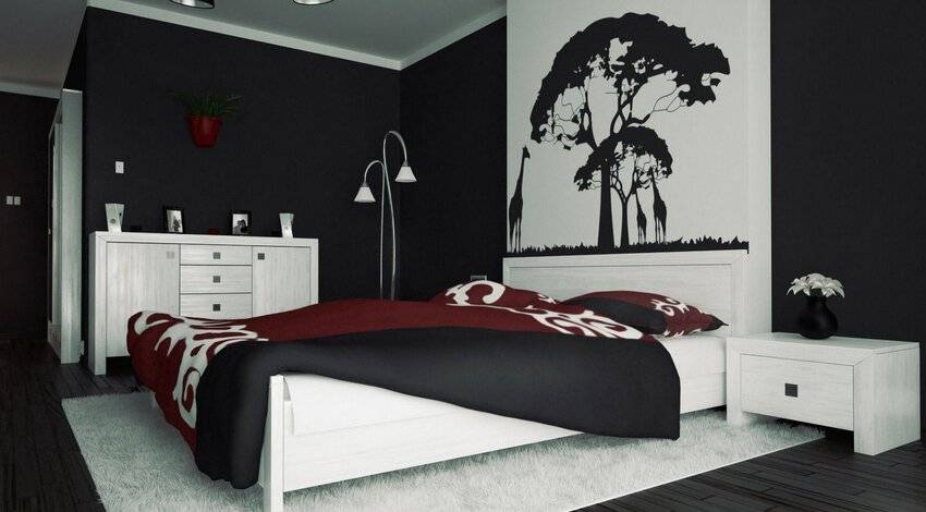 В низкой спальне дизайнеры рекомендуют сочетать черные стены со светлыми потолком и полом. Оптический прием визуально вытягивает пространство. При помощи правильной комбинации тонов узкую прямоугольную комнату можно сделать квадратной. Перегородки с большой стороны красят в темный, с маленькой – в белый.