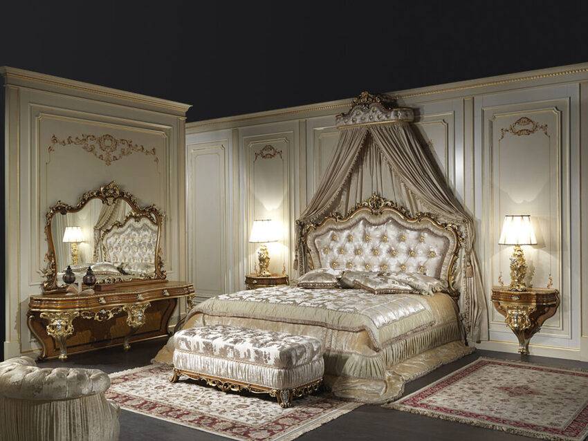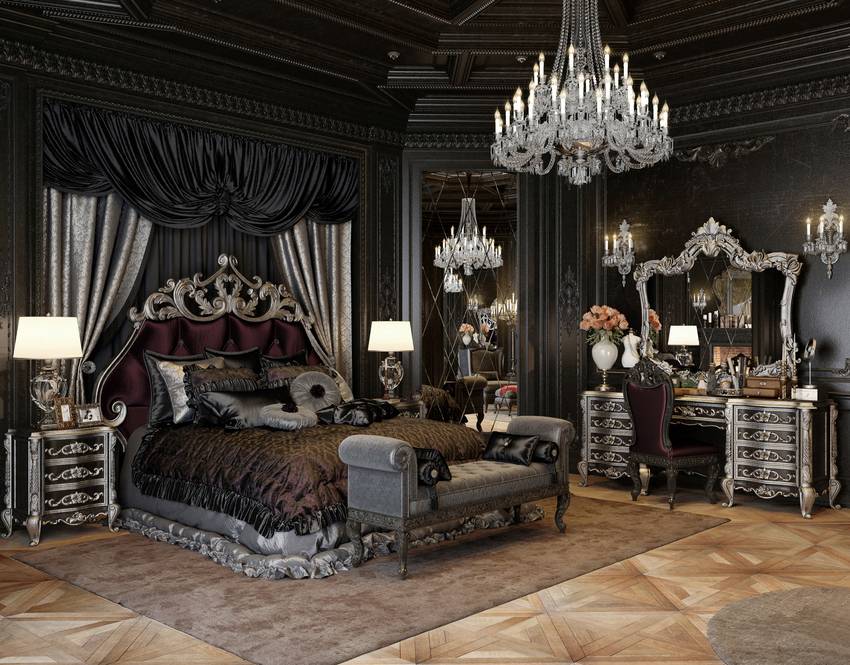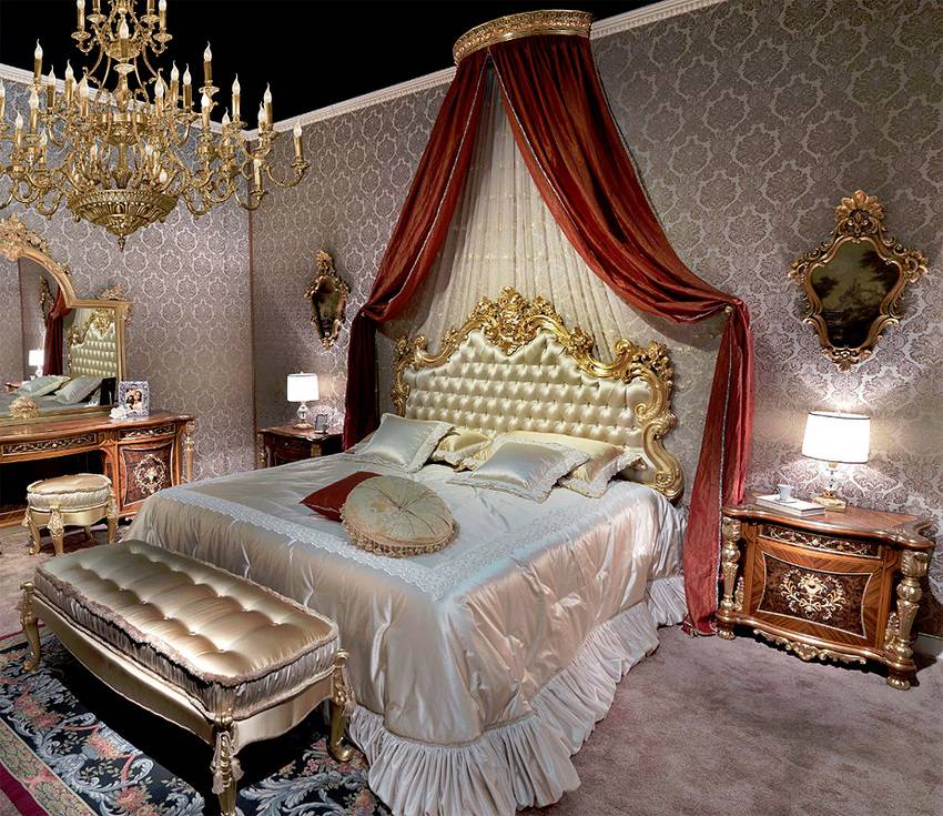 - подобрать тяжелую мебель, украшенную резьбой и инкрустацией. Кровать должна быть с высоким деревянным изголовьем;
