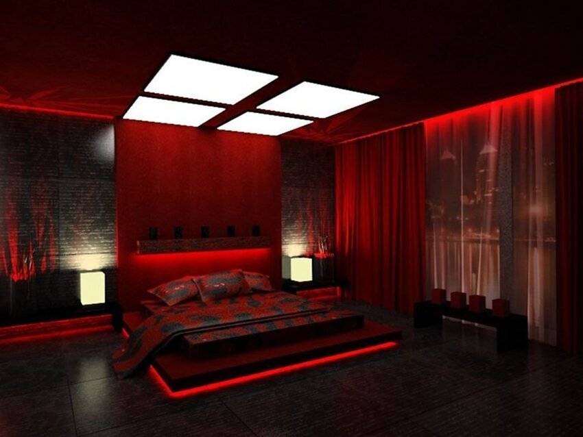 В черном варианте оптимальным решением будет добавление 2-3 цветов. Красные покрывала с ярким рисунком или серые подушки, для добавления контраста с черным и белым цветом. Также контраст может придать пестрая картина на стене.