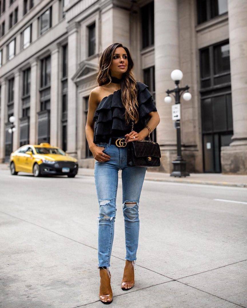 Шорты прекрасно сочетаются с футболками которые имеют V-образный вырез, чокерный воротник, тонкие бретели и блузами с опущенными плечами.