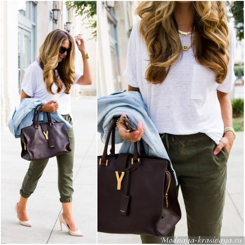 Сочетайте брюки цвета хаки со свитером в тон и дополняйте образ каблуками для большего эффекта. Мы рекомендуем поэкспериментировать с белыми джоггерами и дополнить их базовой футболкой или шелковой рубашкой в тон, чтобы получился ультрамодный образ для летних дней.