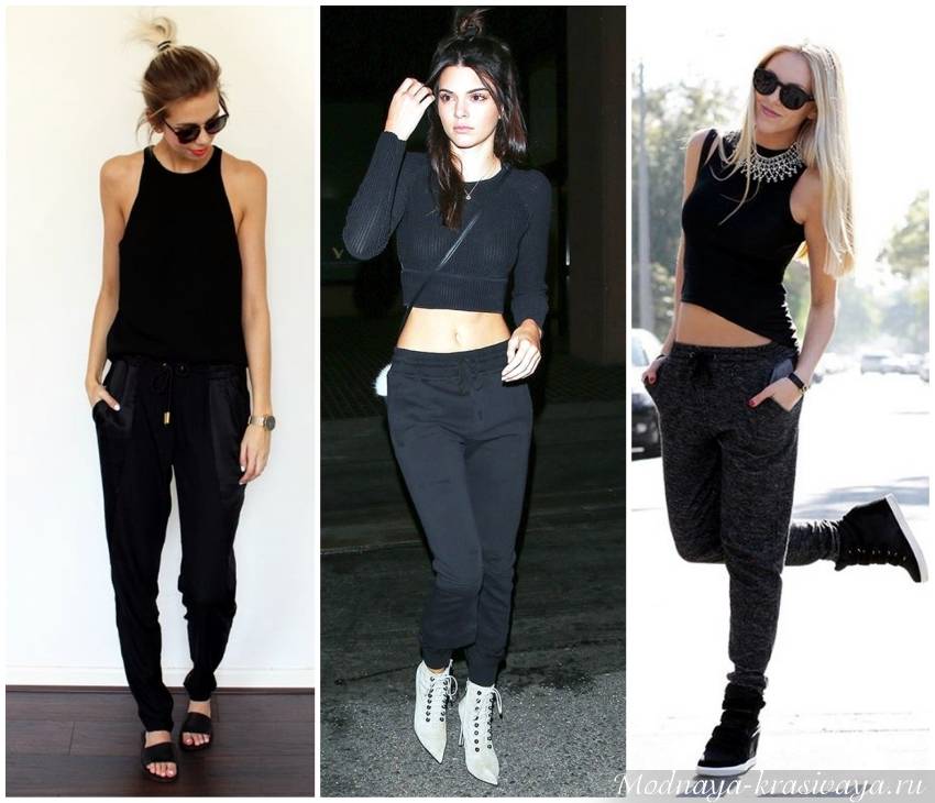 Не следует забывать, что джоггеры пришли к нам из спортивного гардероба, а потому они органично выглядят в комбинации с тренировочными топами, кроссовками, олимпийками и бомберами. Летом сочетайте брюки с кроп-топом и бейсболкой, а осенью – с бомбером или олимпийкой.