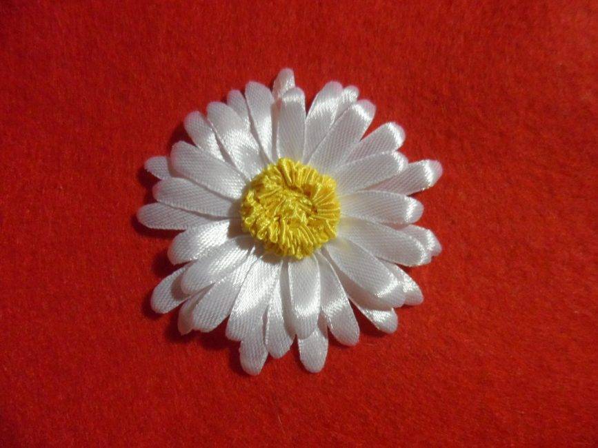 Прежде чем прикрепить под низ два полукруглых лепестка самого насыщенного цвета, закрепим сердцевинку: желтую ленту завяжем в узел посередине и проденем его в центр первого соцветия. Теперь приклеим последнюю часть, а концы желтой ленточки пусть так и выглядывают наружу. Их нужно только немного подравнять и опалить.