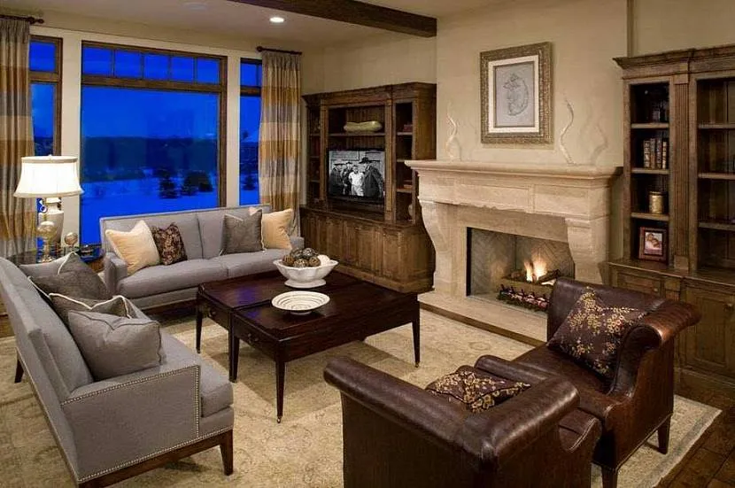 Для отделки стен гостиной комнаты используют не более двух оттенков бежевого. Для создания энергичного интерьера используют кремовый с красным или оранжевым, а для сдержанной гостиной идеально подойдут сочетания бежевого с серым или лиловым. Бежевый с розовым придадут мягкости и нежности, желтый наполнит помещение светом и теплом. Голубой используют для создания интерьера в бежевых тонах, если желают освежить помещение с окнами на юг.