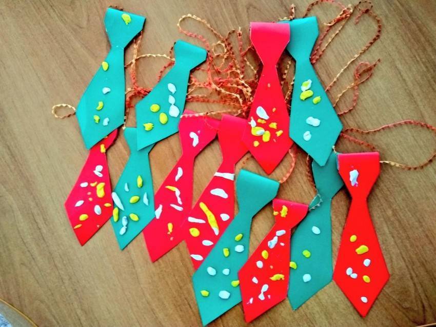Маленькие дети даже могут делать галстуки для папы. Это самое простое — достаточно начертить контур галстука на цветном картоне, вырезать его, украсить рисунками и аппликациями и продеть сквозь него резинку или ленточку.
