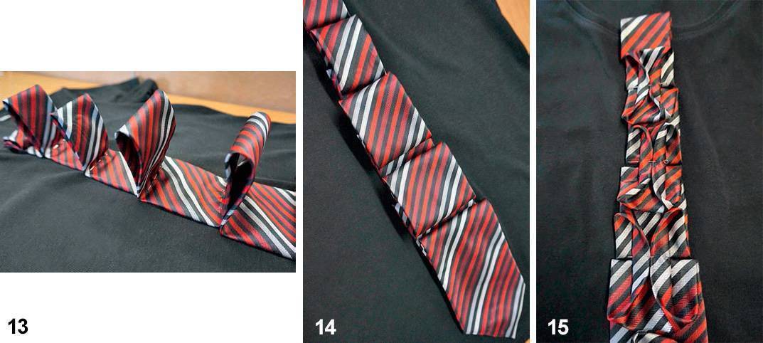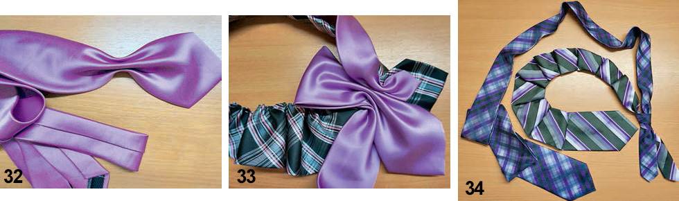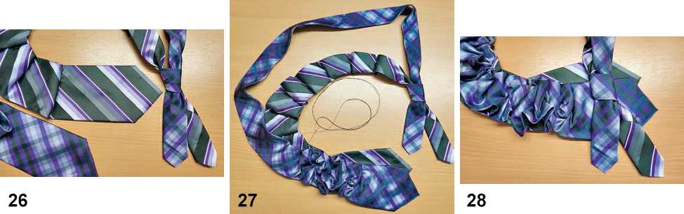 После выполнения основы декора на нее крепится верхняя деталь. Крепление следует начинать с узких концов галстуков – они завязываются «простым» галстучным узлом (25, 26). Длина концов ниже узла составляет примерно 7 см.