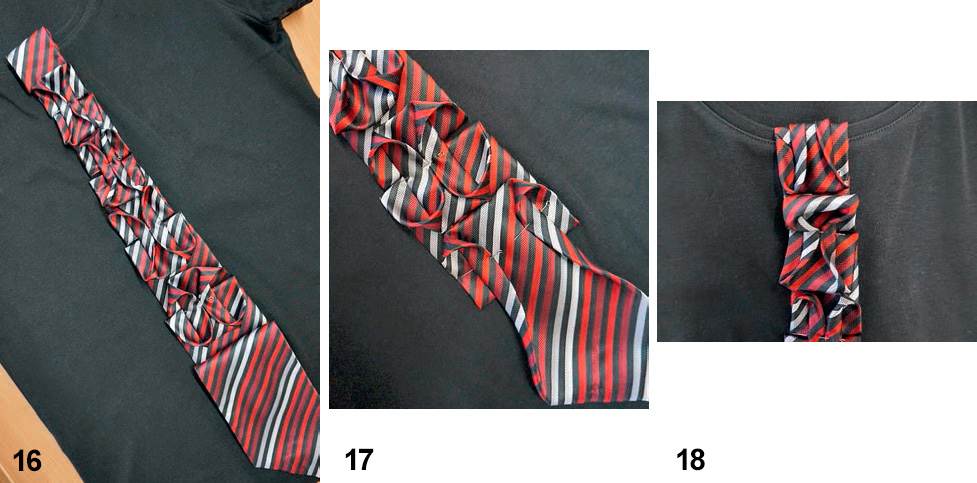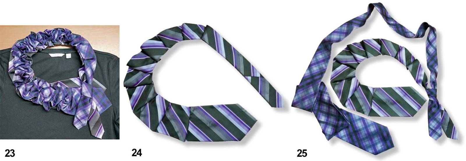 После расчетов разметить положение и глубину складок, сколоть булавками и выполнить закрепки на машине (24). Удалить булавки. «Ожерелье» должно лежать вдоль шеи, повторяя форму тела. Чтобы этого достичь, можно выкладывать галстук, закладывая складки, вдоль горловины готовой футболки или блузки.