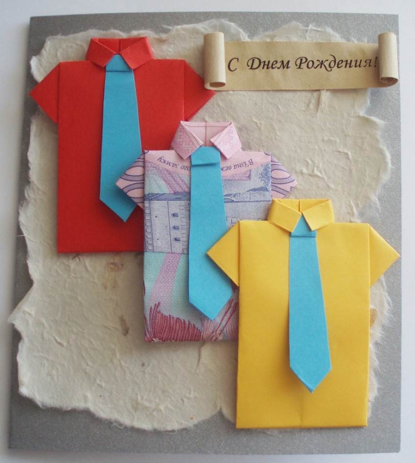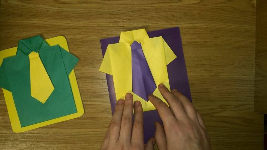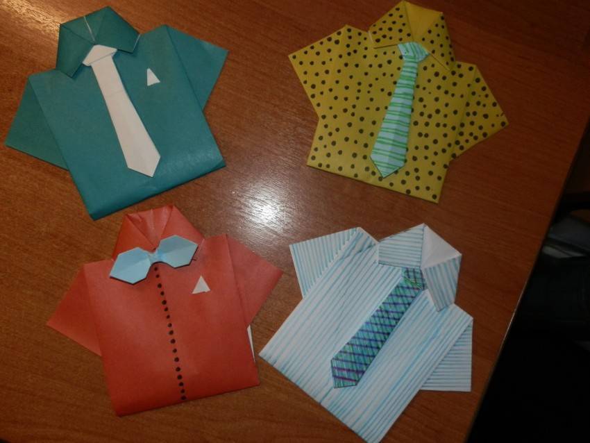 Можно создать и более сложную поделку: рубашку с галстуком. Поделка складывается из разных листов бумаги по схемам и собирается в одно целое. Такие вещи могут пригодиться для создания объемных открыток, а творческие и увлеченные люди могут делать даже бумажных людей, одевая их в такие рубашки.