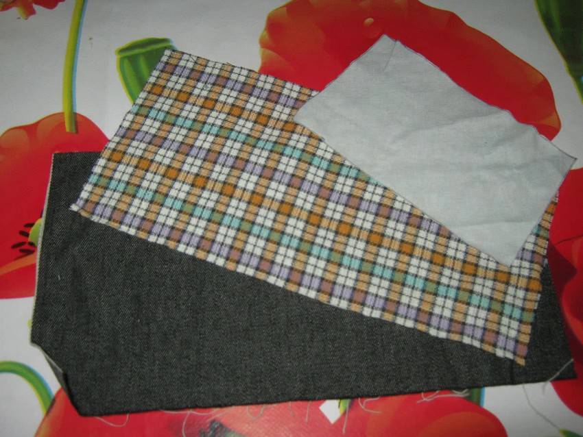 На начальном этапе отмеряют и вырезают прямоугольники, с указанными сторонами, пользуясь для удобства линейкой. Заготовки выкладывают и утюжат. Готовые части накладывают друг на друга и прострачивают на машинке. Правильно на этом этапе выбрать зигзагоподобный стежок, предотвращая таким образом появление затяжек и стрелок на ткани. Сшивать элементы допускается и вручную потайным швом тонкой иглой.