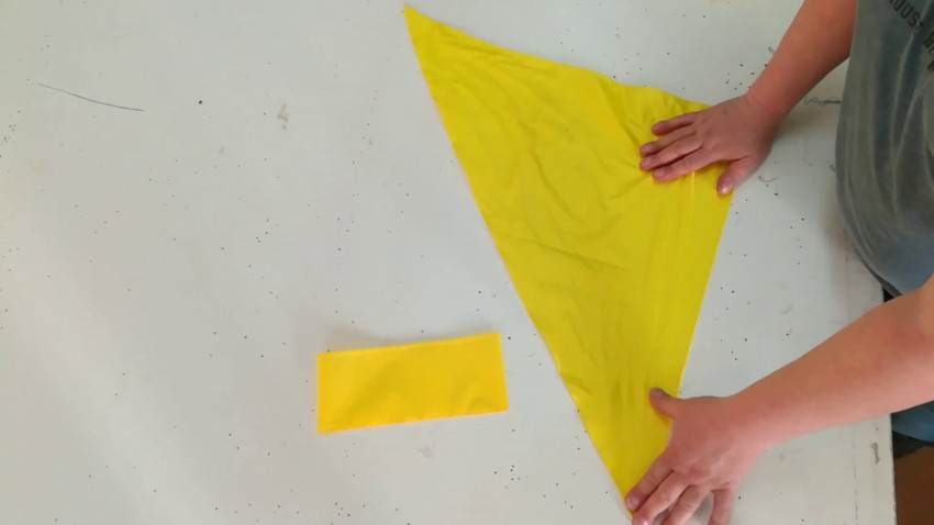 Начинают с подготовки ткани. Это может быть любой тонкий материал, например, атлас. Параметры, указанные для материала выше, подойдут для ребенка от семи лет. Малышам понадобится еще меньше ткани.