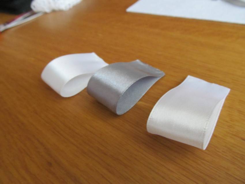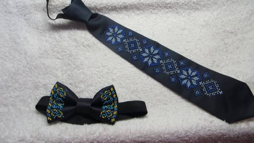 - Перемычку сделать из отрезка атласной ленты или ткани. Сшить кольцом и надеть на галстук.