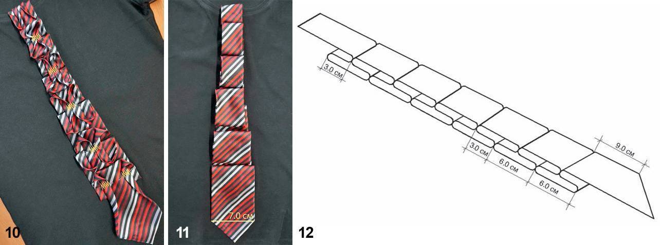 В нашем примере ширина галстука у нижнего конца 7 см (11), далее он, соответственно, сужается. Нужно, чтобы глубина нижней складки равнялась половине ее ширины. Ширина складки 6 см, глубина 3 см. Для остальных складок глубина сохранится 3 см, а ширина будет уменьшаться по мере сужения галстука (12).