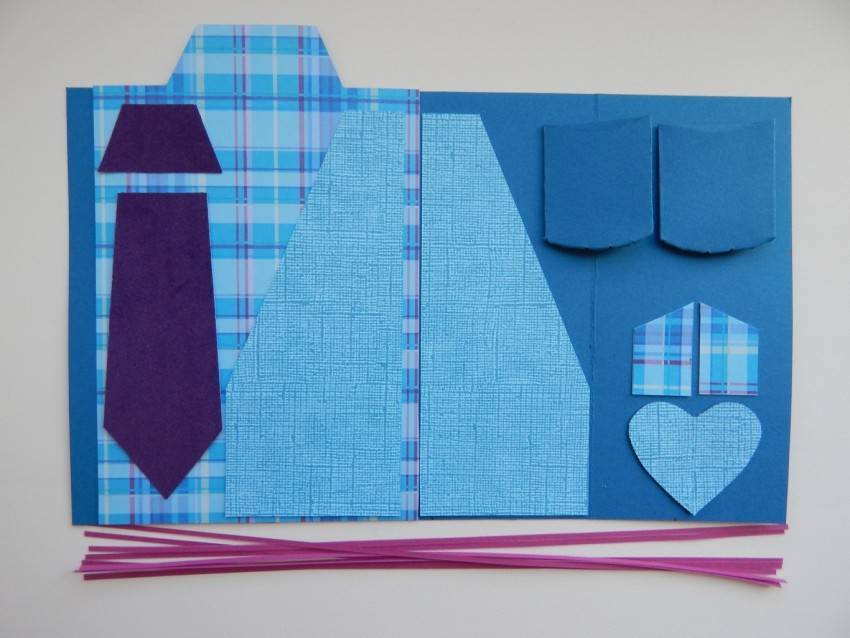 В самом начале делается основание для открытки, лист картона необходимо сложить ровно пополам. Потом на картоне другого цвета следует нарисовать рубашечку. После этого целесообразно вырезать нарисованную фигуру. Сейчас стоит приклеить ее на основание открытки. Теперь необходимо нарисовать и вырезать главные элемент – галстук.