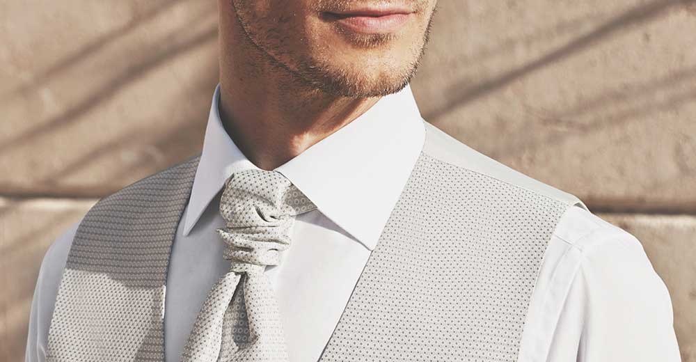 В зависимости от текстуры материала, наличию либо отсутствию узора подбирают широкополый галстук к одежде. В большинстве случаев цветовая комбинация пластрона с жилетом совпадает. Если аксессуар светлый, не следует делать глубокого контраста с рубашкой, пиджаком. Если на жилете есть набивной узор, для центрального элемента одежды выбирают гладкую ткань и наоборот. Пастельные сочетания – это признак аристократизма, поэтому в образе не бывает резких цветовых переходов. Булавка с бусиной, стразы, брошь, повторяющие рисунок на тонком жаккарде, являются достойным декором. Рассмотрим готовые варианты комплектов с пластроном: