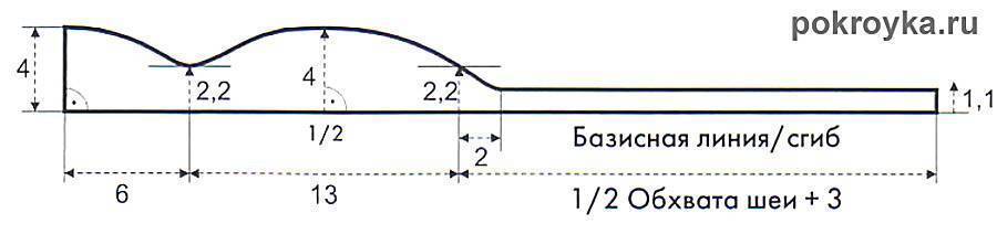 От последней точки по основной горизонтали отложить влево значения величины бабочки (см. чертеж). От полученных точек вверх начертить вертикали. По вертикалям отложить вверх значения в соответствии с чертежом, определить ширину галстука на участке, расположенном под воротником (здесь в готовом виде 2,2 см, то есть на чертеже (в половинном размере) — 1,1 см), и оформить срезы бабочки в соответствии с чертежом.