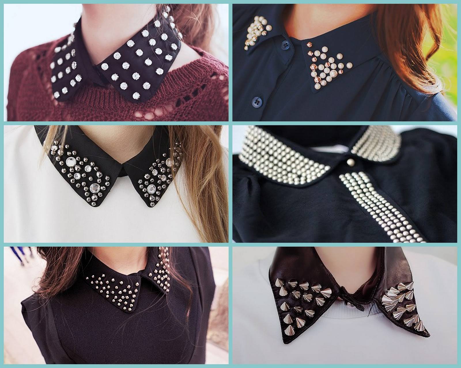 Съемный воротник может использоваться в качестве ожерелья, поэтому его обильно декорируют стразами, камнями, пайетками. Для уличного стиля подойдет классическая отрезная модель рубашечного типа. Ее можно надевать поверх свитера, футболки, кофточки или водолазки.