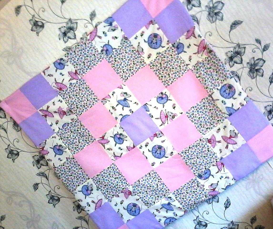 Для начинающих подойдет технология «Быстрый квадрат». Чтобы сделать лоскутное покрывало для девочки, следует выбирать больше розового текстиля, для мальчиков – синего.