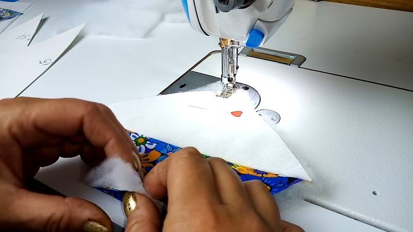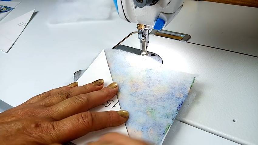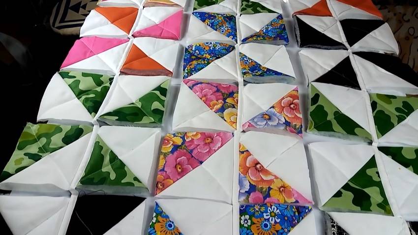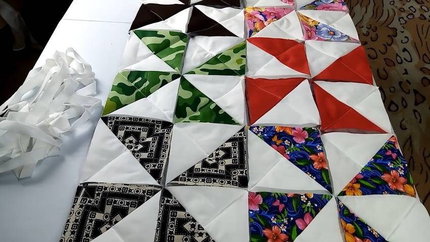 | 3 | ![]() | Далее можете приступать к пошиву лоскутного одеяла: подготовьте по 1-ому цветному, белому квадрату и утеплитель, который нужно аккуратно разделить на 2 части. Уложите тканевые блоки лицом к лицу, на цветной квадрат наложите 1 получившийся слой утеплителя, а другой частью накройте другую сторону заготовки. Проложите строчку по диагонали, для удобства используя бумажный трафарет. |