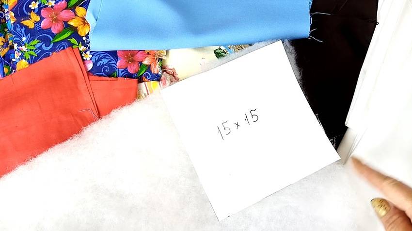 | 1 | ![]() | Для начала вырежьте бумажный квадрат размером 15*15 см. Используя этот трафарет, нарежьте утеплитель и тканевые квадраты. |