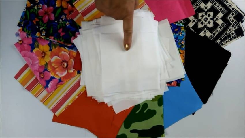 | 2 | ![]() | В итоге должно получиться по 80 разноцветных и белых блоков, а также 80 квадратов утеплителя. Еще подготовьте трикотажную бейку (желательно белого цвета) толщиной 4 см. |