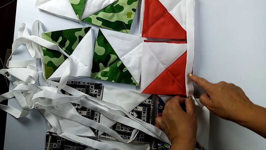 | 6 | ![]() | Затем приложите бейку к краю квадратов и прострочите ее посередине. К другой стороне ленты пришейте следующую полосу заготовок. То же самое проделайте с оставшимся материалом. |