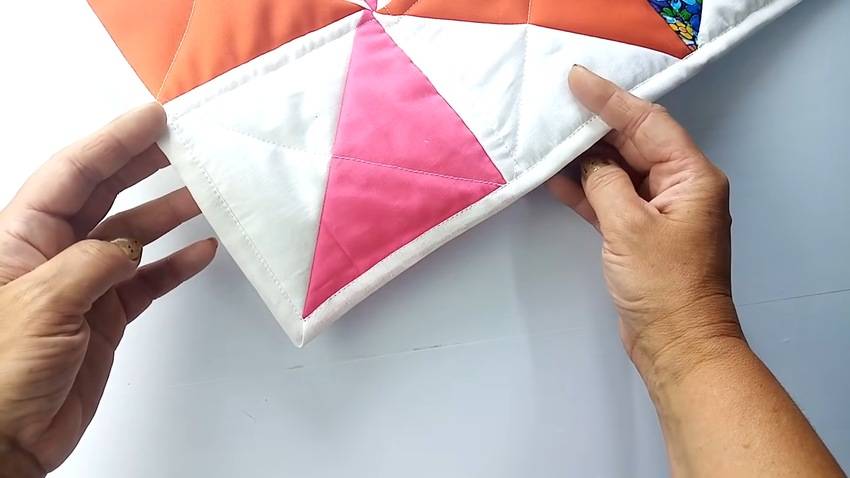 | 9 | ![]() | Теперь нужно сделать окантовку: аккуратно приложите ленту по краю изделия, отступая от угла 5 см, и прострочите на расстоянии 7 – 8 мм. |