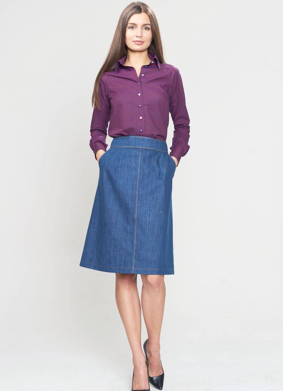 К юбкам из денима подходят рубашки простых фасонов из натурального хлопка. Они могут быть клетчатыми или в полоску, чаще всего вертикальную. Джинсовые модели из грубой ткани можно удачно дополнить джинсовой рубашкой, более светлой и тонкой. Сорочка цвета хаки, правильно подобранная в тональном отношении, придаст наряду легкий налет в стиле милитари. Однако в этом случае придется позаботиться о дополнительных аксессуарах и соответствующей отделке.